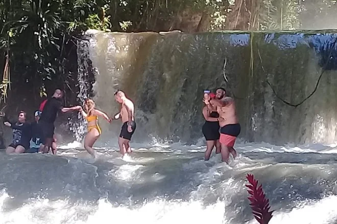 Lo primero que noté en YS Falls no fue el agua, sino cómo cambiaba el aire. Sales de la van de Marlon (que ya se está riendo de algo, probablemente de mi cara con protector solar) y de repente todo huele a verde, como hojas mojadas y piedras de río. Bajo los árboles hay un silencio especial, salvo por el sonido de las cascadas, que son más fuertes de lo que esperaba, no rugen, pero caen constantes, como si alguien estuviera vertiendo un cubo gigante sin parar. Marlon nos señaló un lugar donde a veces se lanzan los locales; yo no me animé (quizá la próxima), pero ver a un par de niños saltar fue casi igual de emocionante.