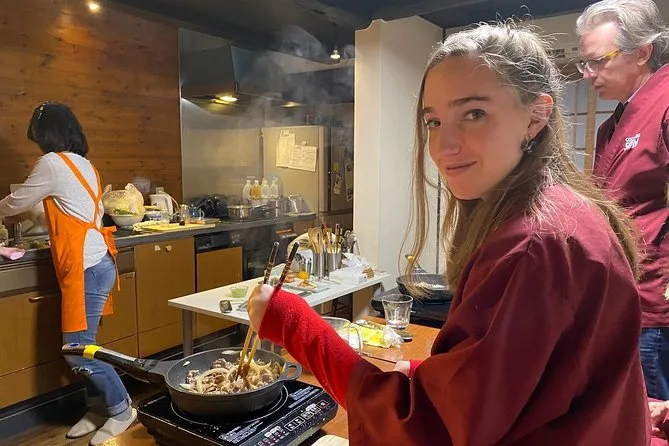 Entramos a la cocina en Kyoto y el aroma a salsa de soja y algo tostado nos recibió — no sabía bien qué era, pero me abrió el apetito al instante. Nuestra instructora, Emi-san, nos saludó con una reverencia rápida y una sonrisa enorme. Nos entregó delantales (el mío era un poco largo y me tropezaba con él) y empezamos con los primeros platos izakaya. La cocina era pequeña pero acogedora, con vapor saliendo de las ollas y ese sonido tranquilo que solo se escucha cuando todos están concentrados. Nunca había hecho albóndigas de pollo y bardana a la parrilla; Emi nos enseñó a darles la forma perfecta y luego nos dejó probar la hoja de shiso cruda — un sabor entre menta y hierba fresca. Me gustó más de lo que esperaba.