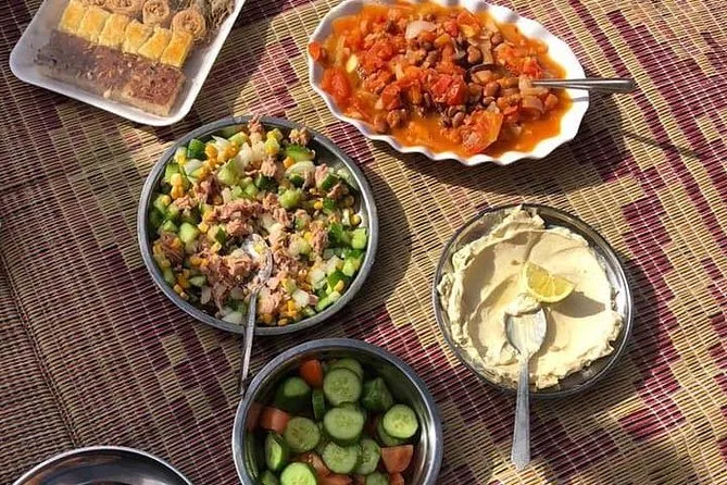 El almuerzo fue sencillo: pan plano recién hecho al fuego, pollo a la parrilla y tomates frescos con za’atar. Comimos a la sombra mientras dos niños locales cuidaban cabras cerca—uno nos saludó tímidamente. Más tarde subimos al Puente de Piedra Pequeño (menos intimidante de lo que suena) y vimos el atardecer desde el Desierto Blanco, donde todo se volvió dorado pálido y silencioso otra vez. A veces todavía pienso en esa luz.