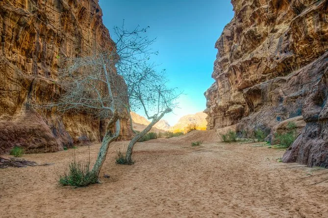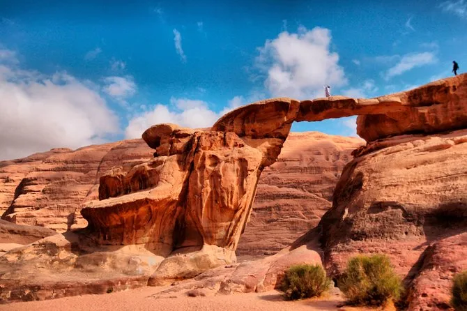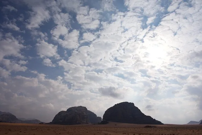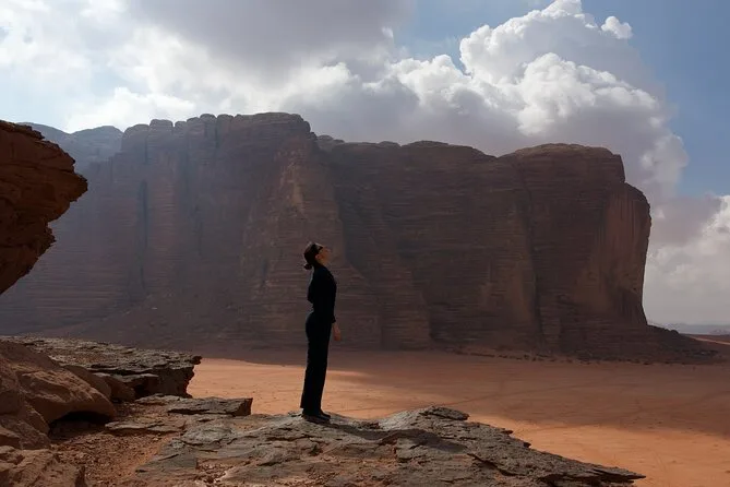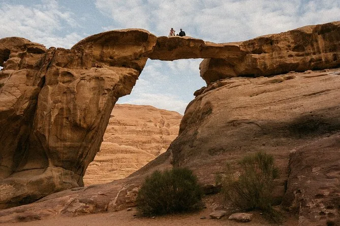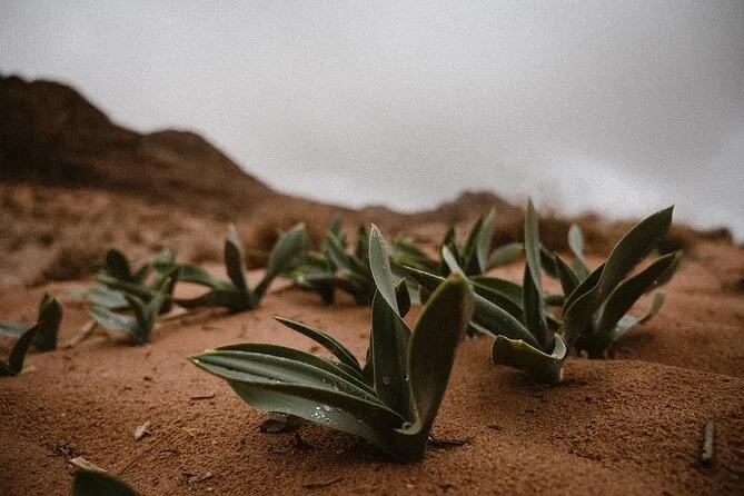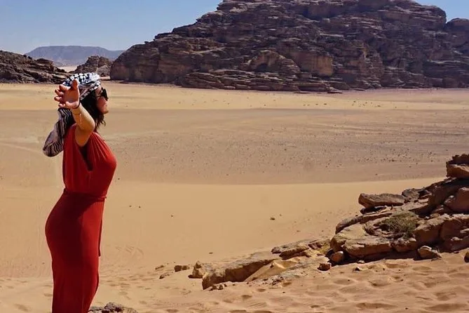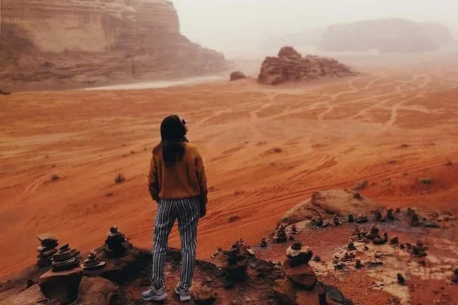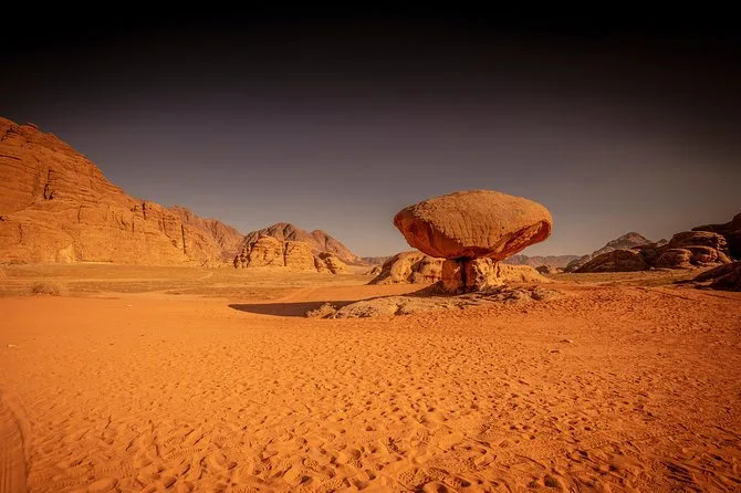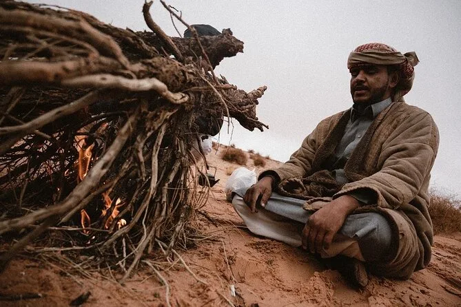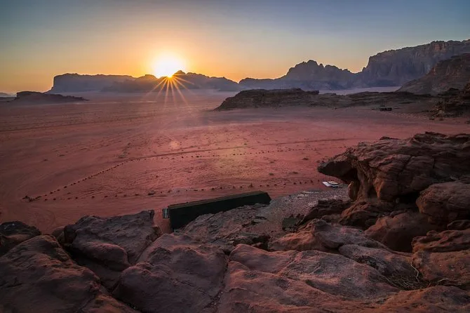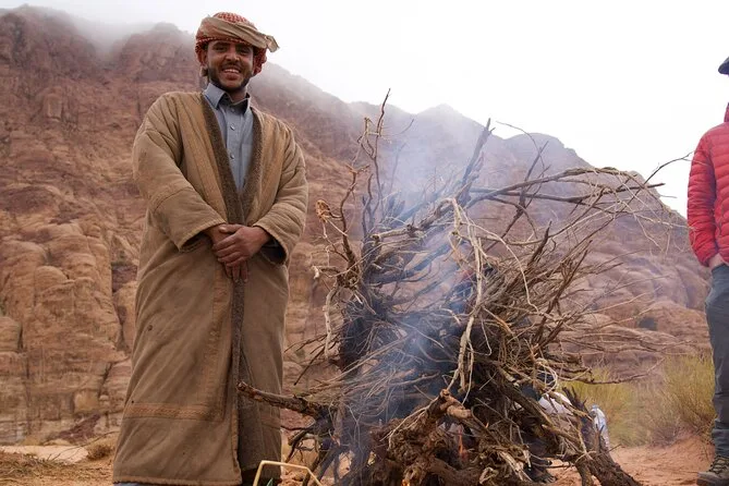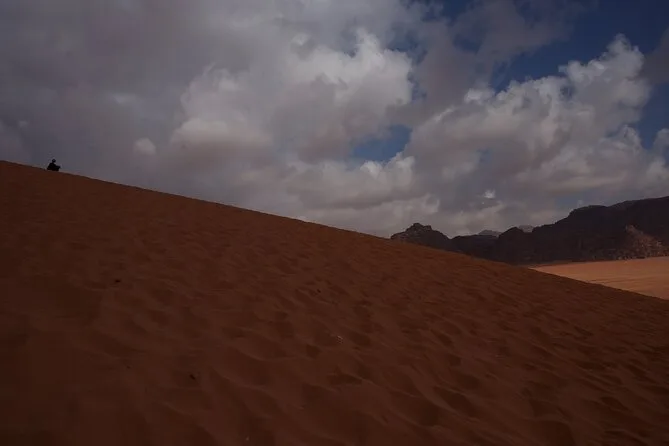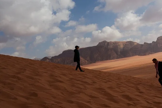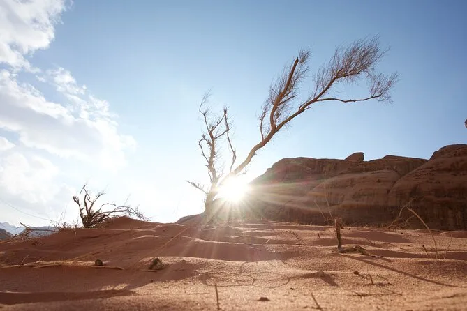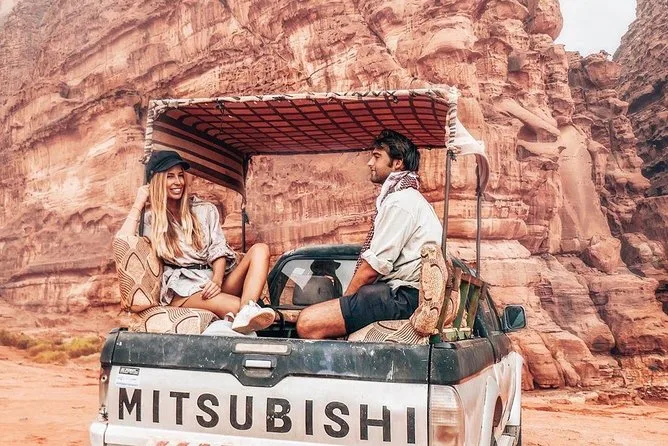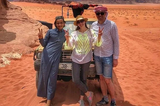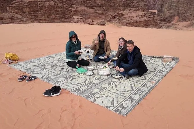 Tu día incluye recogida en la Casa de Descanso de Wadi Rum en 4x4 con un guía local; paradas en el Manantial de Lawrence, petroglifos del Cañón Khazali, Duna Roja para sandboarding gratis; almuerzo con té beduino; vista del atardecer; noche en tienda beduina tradicional con cena; desayuno al día siguiente; y agua embotellada durante todo el recorrido.