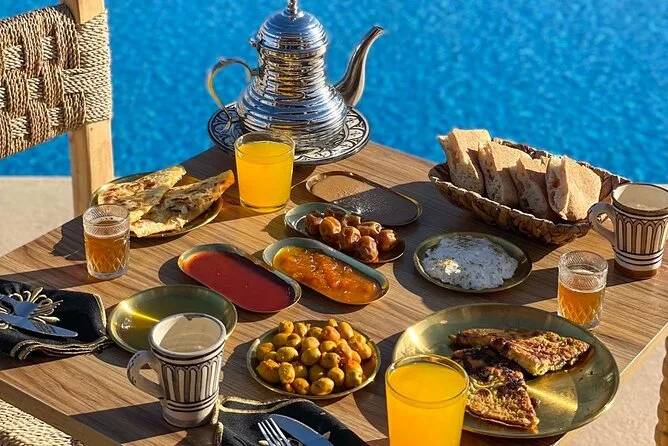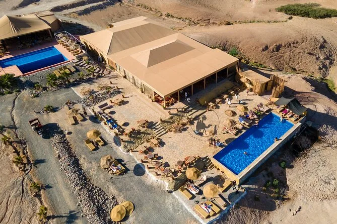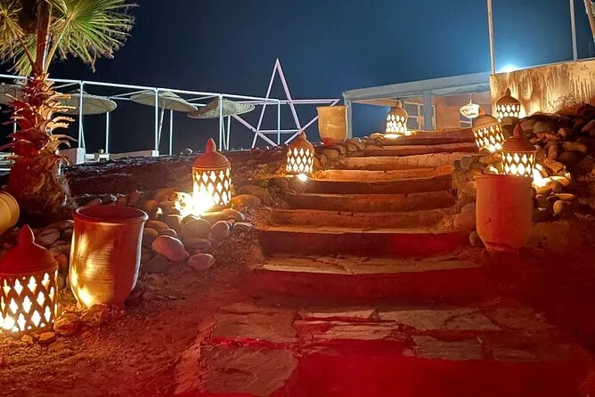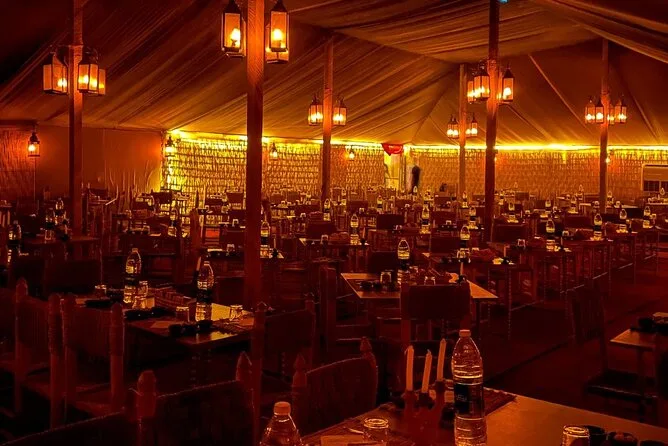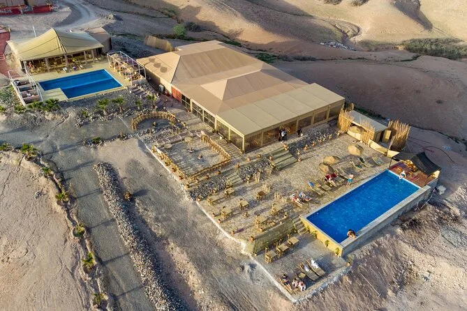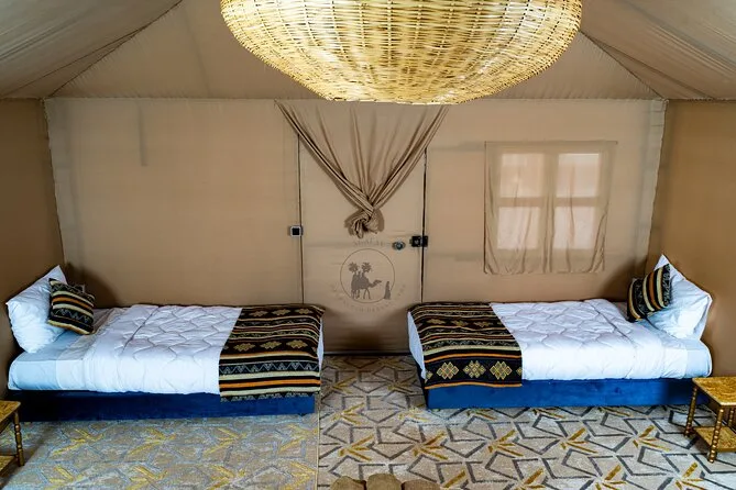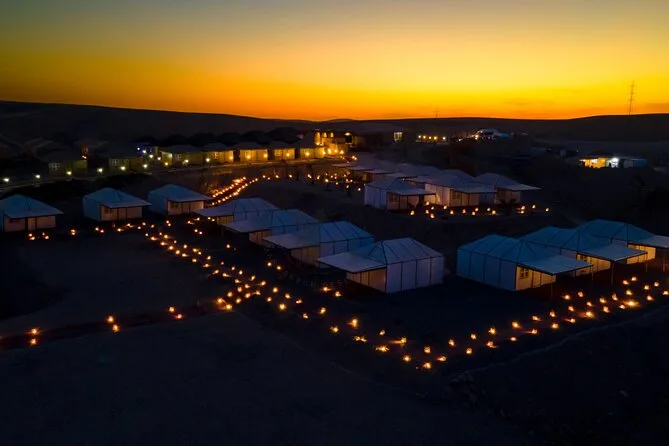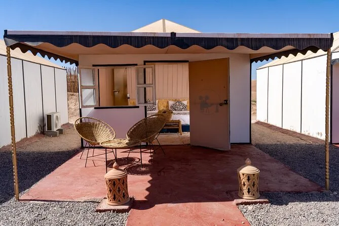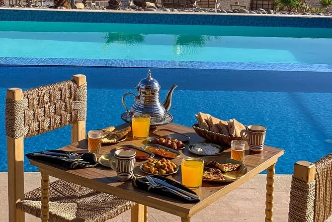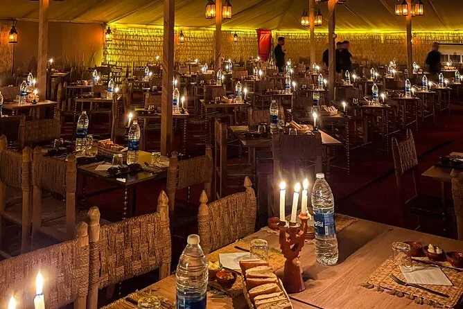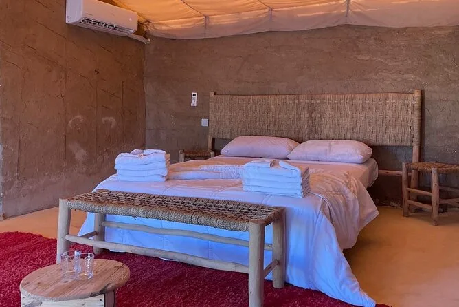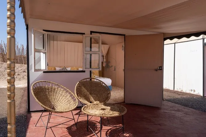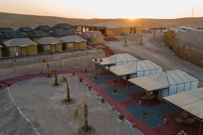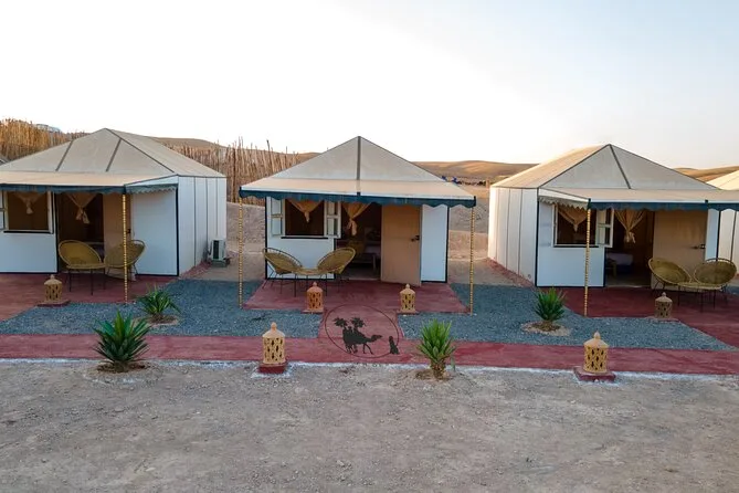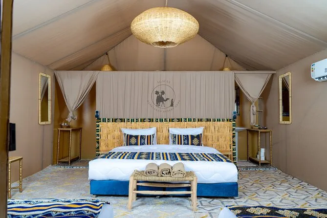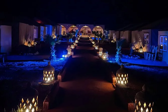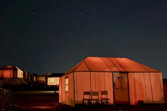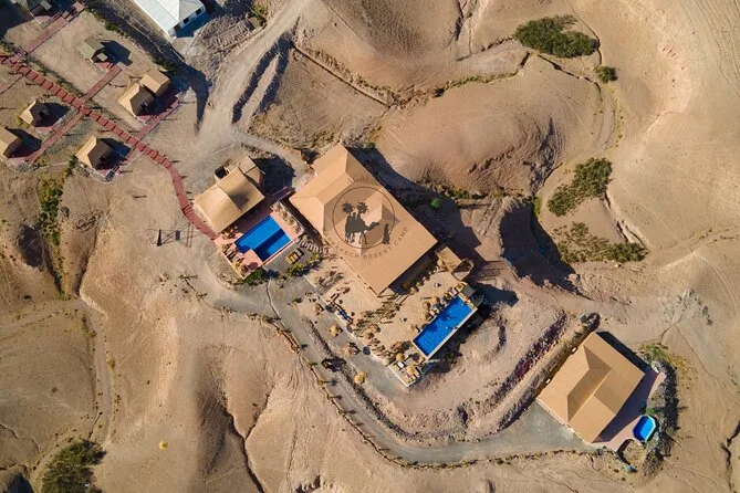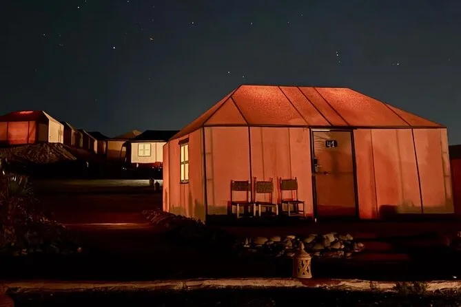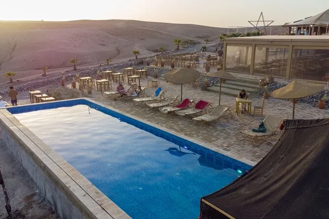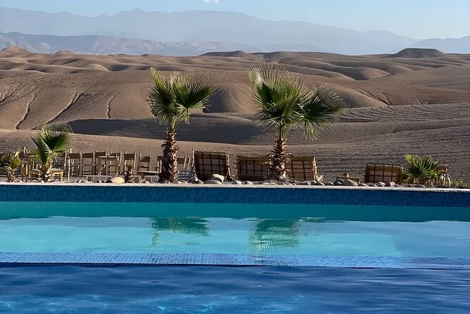 Tu experiencia incluye recogida en Marrakech en vehículo con aire acondicionado, agua embotellada durante toda la estancia, té de menta de bienvenida al llegar al campamento de Agafay, acceso a piscina, alojamiento nocturno en tienda privada o dormitorio (según tu elección), cena tradicional marroquí de tres platos con espectáculo en vivo junto a la hoguera, y desayuno antes de regresar a la ciudad.