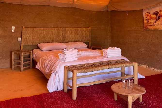 Desde Marrakech cruzarás al desierto de Agafay para pasar la noche en una tienda deluxe con camas reales y acceso a piscina. Disfruta un té de bienvenida, luego relájate o elige un paseo en camello o quad antes del atardecer. Cena con música y espectáculo tradicional junto a la hoguera, y duerme bajo un cielo estrellado sin fin—despierta con la calma del desierto y pan fresco al amanecer.