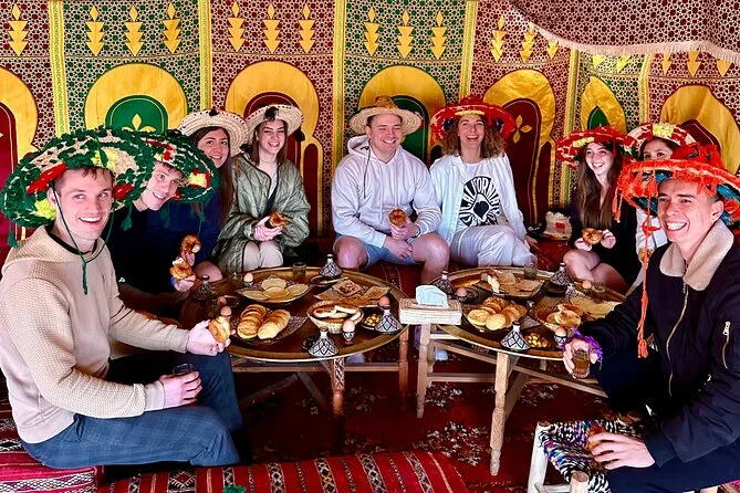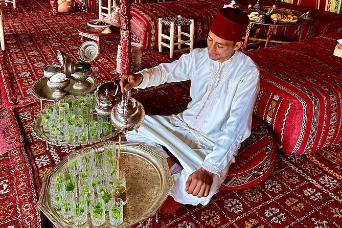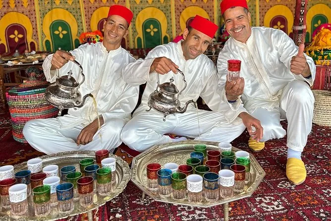 Tu mañana incluye recogida en 4x4 desde Marrakech, pastas y té o café mientras ves preparar el globo, un vuelo de 40-50 minutos sobre las laderas del Atlas al amanecer con piloto y guía expertos, seguido de un desayuno bereber recién hecho en una tienda en la montaña antes de volver a Marrakech — además de un certificado de vuelo como recuerdo.