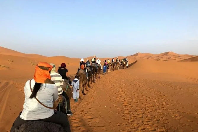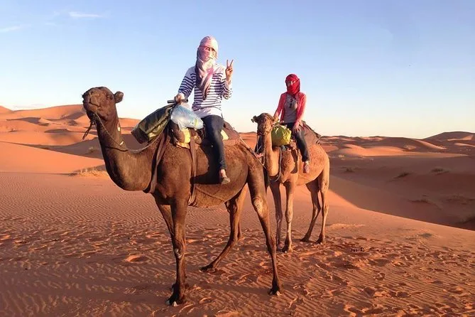 Incluye transporte con aire acondicionado y guía/chofer de habla inglesa. Pasarás una noche en un campamento de lujo en el desierto (con cena y desayuno), otra en un hotel en el valle del Dades (también con cena y desayuno), además de paseos en camello por las dunas de Merzouga e incluso sandboard si te animas.