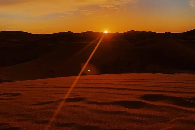 Ya por la tarde, aparecieron los puestos de dátiles y tiendas de fósiles en Erfoud. Conocimos a un artesano local que nos mostró fósiles de ammonites sacados directamente de la roca del desierto; sus manos estaban manchadas de polvo y resina. Luego llegamos a Merzouga y a esas primeras vistas de las dunas de Erg Chebbi. La arena estaba cálida bajo los pies, aunque el sol ya bajaba. El paseo en camello al atardecer es otra historia: el silencio es inmenso, solo roto por el sonido de los cascos y alguna brisa ocasional. La cena en el campamento fue tranquila: tagine, té de menta dulce, música alrededor del fuego y un cielo tan lleno de estrellas que parecía irreal. Dormir en una jaima al estilo nómada (sin aire acondicionado pero con muchas mantas) fue como detener el tiempo.
