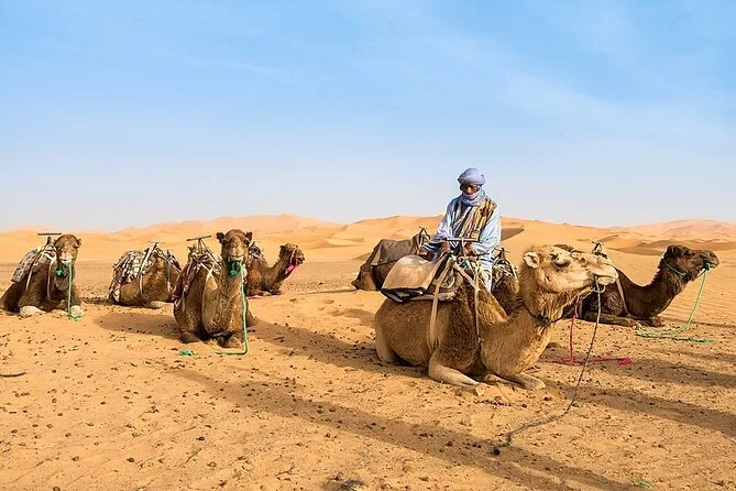 Tu tour incluye recogida en aeropuerto u hotel en Fes y traslado en Marrakech; transporte privado con aire acondicionado; WiFi a bordo; agua embotellada diaria; pausas para té de menta marroquí; entradas a monumentos (incluyendo estudio de Ouarzazate); paseo en camello con guías expertos; experiencia de sandboarding; manejo de equipaje; alojamiento en tienda de lujo en el Sahara (privada) y kasbah auténtica; además de soporte 24/7 durante todo el viaje.