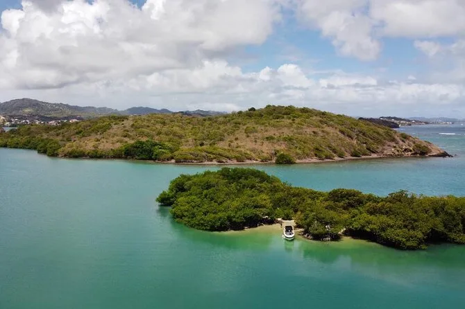 Tu día incluye un paseo guiado en barco desde el puerto de Le François entre manglares y arrecifes, con paradas en varios islotes como Chancel (para ver iguanas) y la Baignoire de Joséphine para nadar; agua embotellada; bebidas alcohólicas; snacks; además de un almuerzo local antes de regresar a tierra—todo acompañado por un guía local experto.