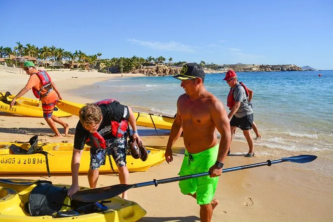 Remarás en kayak con fondo de cristal desde Bahía Santa María con un guía local, viendo peces bajo tus pies antes de hacer snorkel en las aguas tranquilas de Bahía Chileno. Agua clara, risas fáciles, transporte desde el hotel y tiempo para relajarte en la arena tras nadar. Si buscas la vida marina de Cabo San Lucas sin multitudes ni botes, esta es la mejor opción.