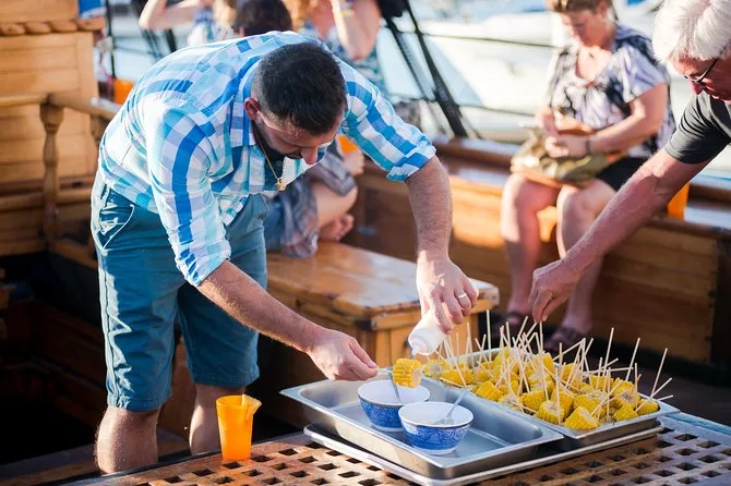 Después navegamos frente a Playa del Amor y Playa Médano — ambas llenas de gente pero con una calma especial desde el mar. Nuestra guía, Carla, señaló Roca Pelícano (“el mejor lugar para hacer snorkel si no te importa que los peces te miren fijamente,” bromeó) antes de anclar. Meterse al agua fue más frío de lo que imaginé; di un pequeño grito, pero luego solo floté, viendo peces coloridos nadar entre mis pies. El almuerzo fue sencillo pero delicioso — tacos de pescado a la parrilla y un postre que no supe cómo llamar. La barra libre hizo que alguien siempre estuviera rellenando mi copa antes de que la terminara.