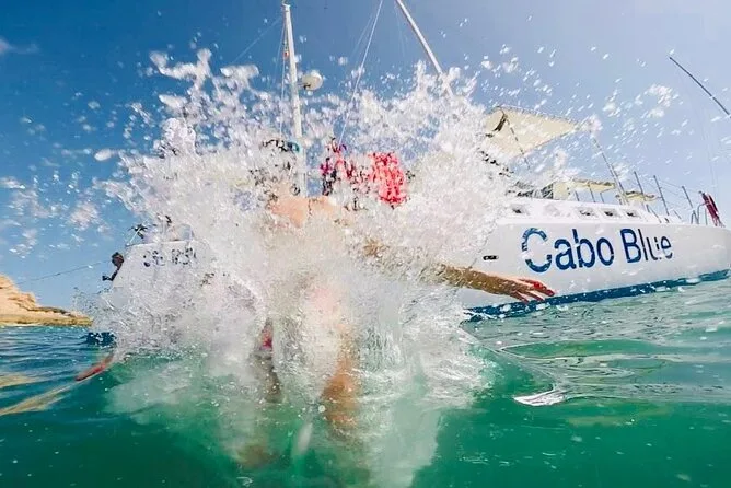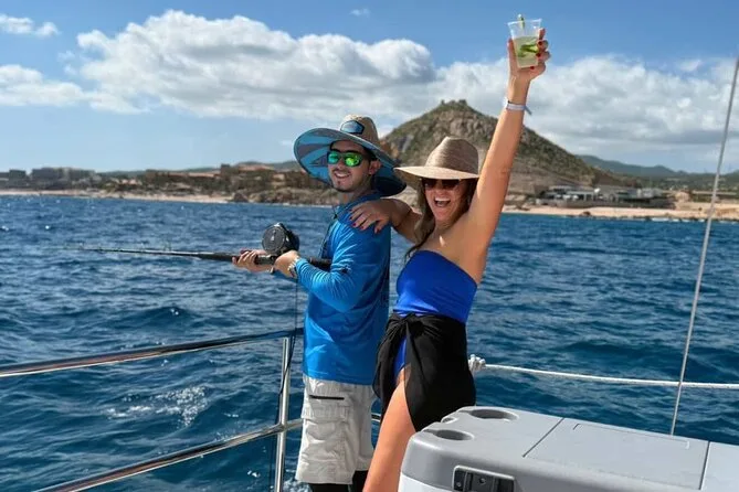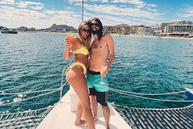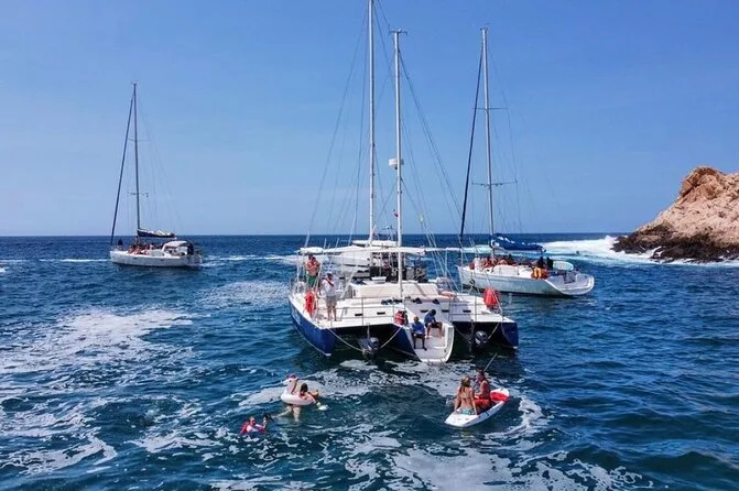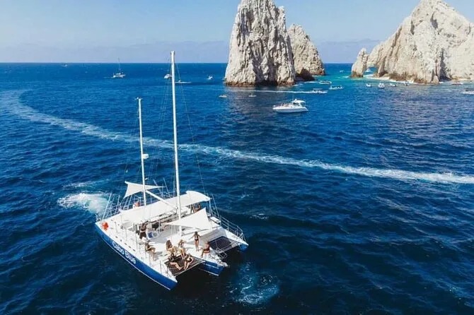 Tu día incluye recogida en la marina de Cabo San Lucas antes de abordar un amplio trimarán privado con tripulación local; todo el equipo de snorkel, paddle boards y una alfombra flotante están incluidos; disfruta bebidas ilimitadas de barra libre durante el paseo; se sirve comida después del snorkel en la bahía de Santa María antes de regresar por la costa juntos.