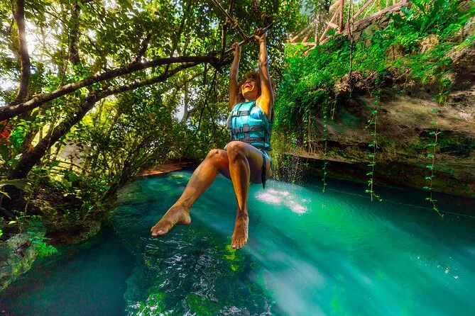 También conducirás ATVs por senderos en la selva, probarás tres tirolesas con puentes colgantes y nadarás en un cenote natural maya.