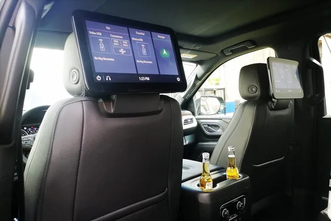 El SUV estaba casi demasiado limpio — parecía que habían limpiado cada rincón dos veces. Al entrar, el aire frío me dio en la cara y ya había dos Coronas esperando en el mini bar (y agua si prefieres). Nuestro conductor nos entregó toallitas refrescantes para la cara — no lo esperaba, pero me despertó al instante. Charló sobre dónde creció en Quintana Roo y nos señaló qué resorts valía la pena evitar. También había WiFi a bordo, así que le mandé un mensaje a mi mamá para avisarle que habíamos llegado bien. Todo se sentía relajado pero también… cuidado, ¿sabes? Difícil de explicar.