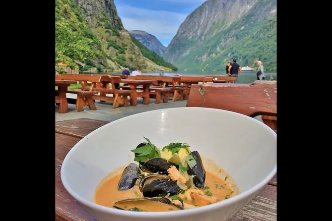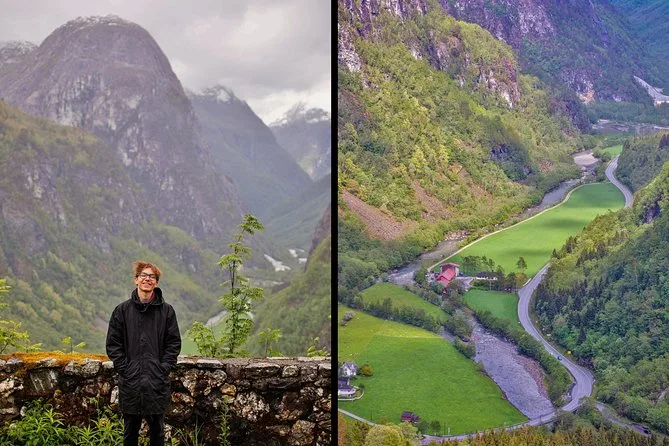 El viaje hacia el valle de Nærøydalen fue tranquilo, solo se escuchaba el suave murmullo del coche y las historias de Ola sobre mensajeros que desafiaban estas montañas hace siglos. En el hotel Stalheim, salimos a la terraza — sinceramente, aún recuerdo esa vista. El valle parecía casi irreal, como pintado con un verde demasiado intenso. Luego bajamos a Gudvangen, escondido bajo la cascada Kjelfossen (que se escucha antes de verse). El almuerzo fue sencillo pero reconfortante en la cafetería del hotel — pan integral, sopa y café fuerte, justo para despertar a un vikingo.