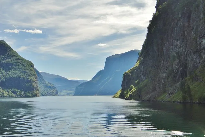 Si quieres añadir un crucero por el fiordo (como hicimos nosotros), sale justo desde Gudvangen hacia Flåm por el Nærøyfjord. El agua está tan quieta que refleja todo — acantilados, nubes, incluso tu cara si la miras el tiempo suficiente. Los tickets no están incluidos por defecto pero Ola nos ayudó a conseguirlos en el último momento. De regreso, atravesando esos túneles interminables hacia Bergen, todos guardamos silencio un rato — quizás cansados o simplemente dejando que todo calara hondo.