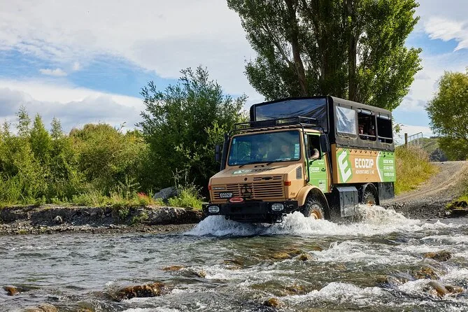 Un Unimog 4x4 especialmente diseñado te lleva por ríos y tierras de cultivo hasta las tirolinas.