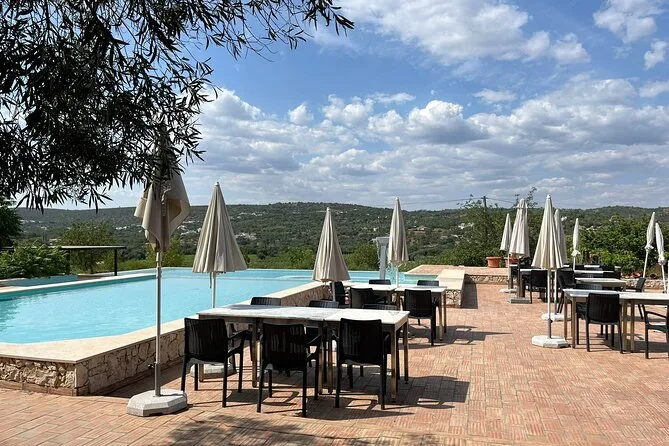 Tu día incluye cuatro catas de vinos del Algarve acompañadas de pan casero fresco con aceite de oliva, además de tablas de quesos y embutidos regionales. Tendrás acceso a la terraza soleada o al salón con chimenea según la temporada — y uso completo de la piscina si te apetece darte un chapuzón entre sorbos.