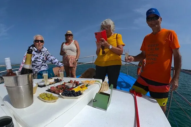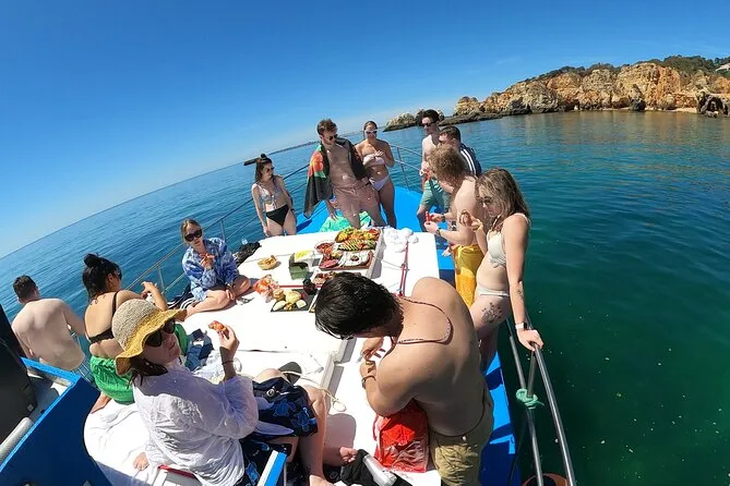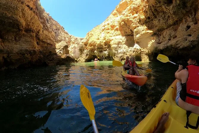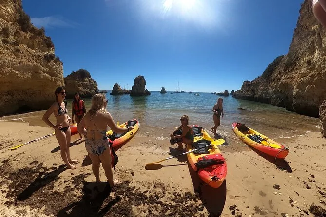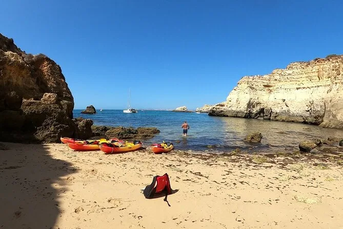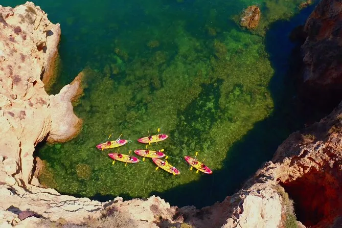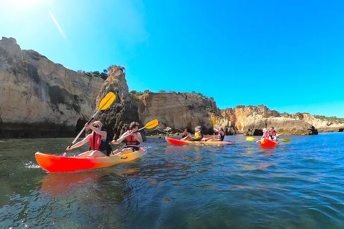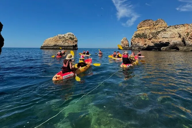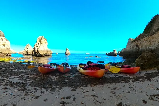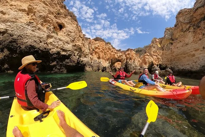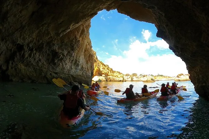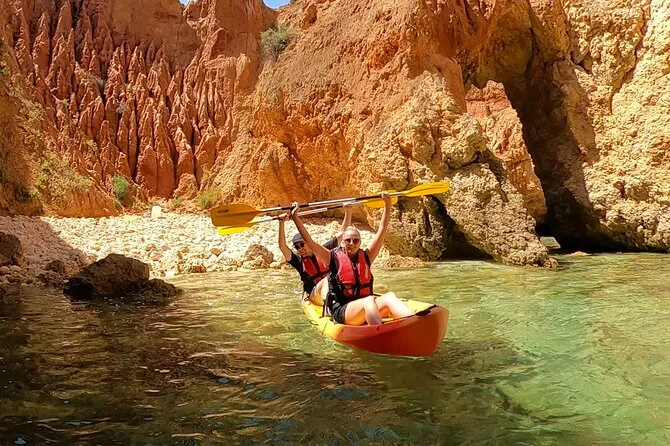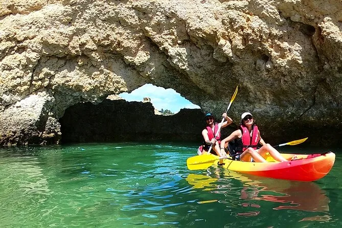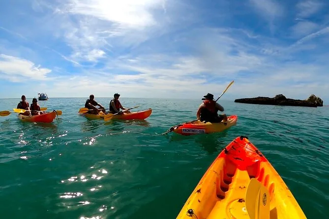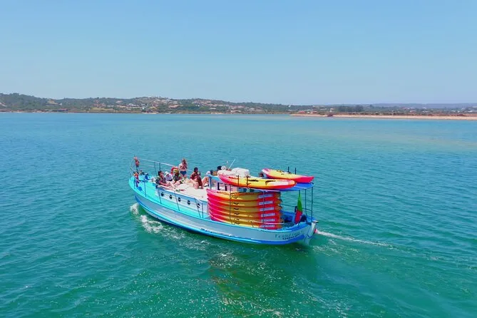 Tu día incluye un paseo guiado en barco Frontino desde la ría de Alvor con todas las tasas incluidas, uso de kayaks dobles (con chalecos salvavidas), historias del patrón local, snacks a bordo y tiempo para nadar o relajarte en calas escondidas antes de volver en barco.
