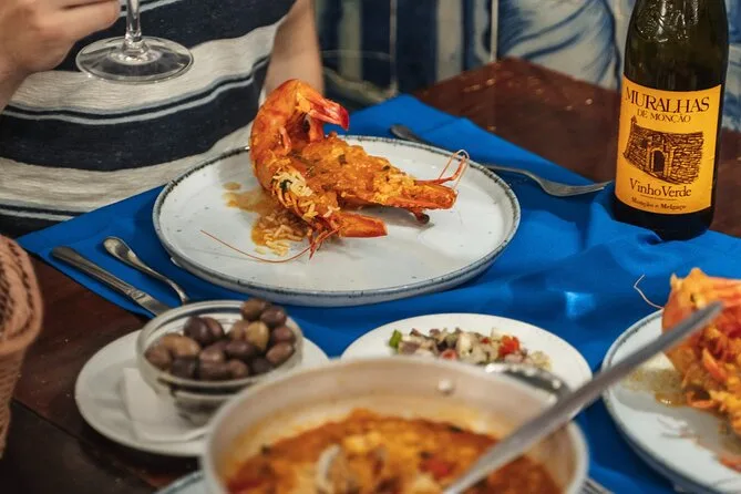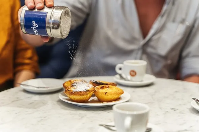 Recorrerás Baixa probando petiscos de chorizo en tabernas acogedoras, disfrutando arroz con mariscos y Vinho Verde, mordiendo bifanas y coxinhas, saboreando Ginjinha en una tienda histórica y terminando con un pastel de nata caliente. Es un tour lleno de vida, risas y auténticas historias que capturan el alma de Lisboa.