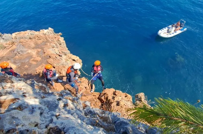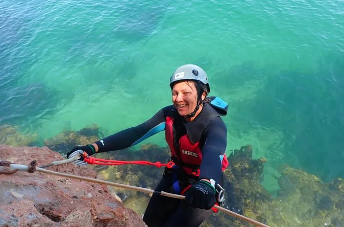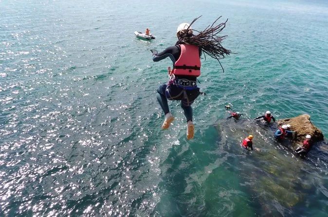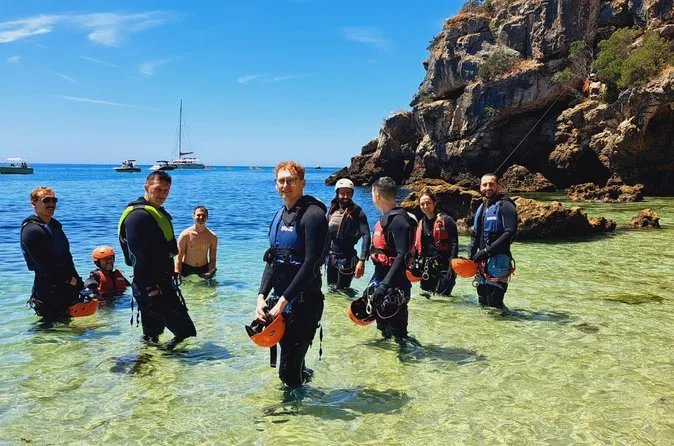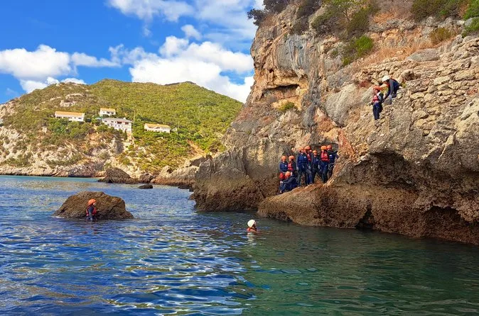 Es una aventura guiada que combina saltos desde acantilados, escalada, rápel, natación, exploración de cuevas, deslizamientos y senderismo por la costa de la Serra da Arrábida.