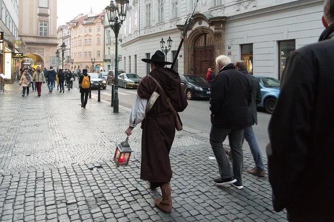 Seguirás al Vigilante nocturno de Praga por calles oscuras desde la Torre de la Pólvora hasta el Puente Carlos, probarás pan tradicional, escucharás historias de nobles y gente común, y te detendrás junto al Moldava para contemplar el Castillo—algo en pasear estas viejas calles de noche se queda contigo mucho después.