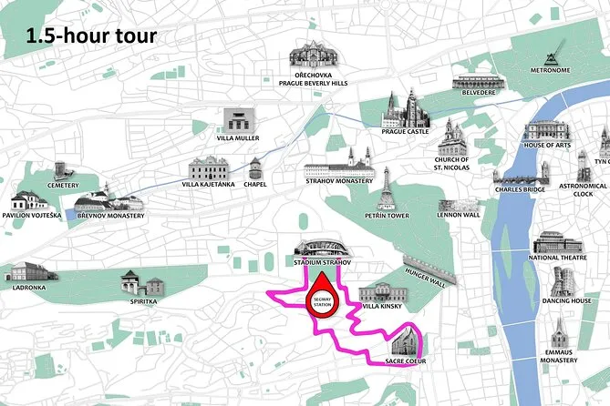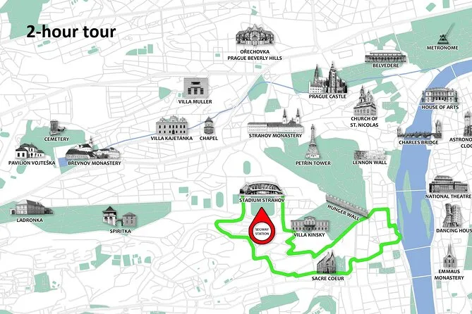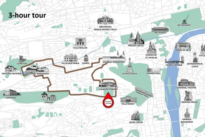 El recorrido es por zonas fuera del centro donde está permitido usar Segways, como el parque Ladronka y cerca del Estadio Strahov.