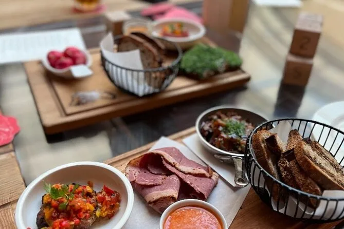 Tu noche incluye degustaciones guiadas en tres pubs de Praga (incluyendo una microcervecería en funcionamiento), al menos seis tipos de cerveza artesanal checa acompañadas de snacks clásicos como queso marinado y salchicha, además de un guía local experto que acompaña a tu grupo pequeño durante toda la experiencia.