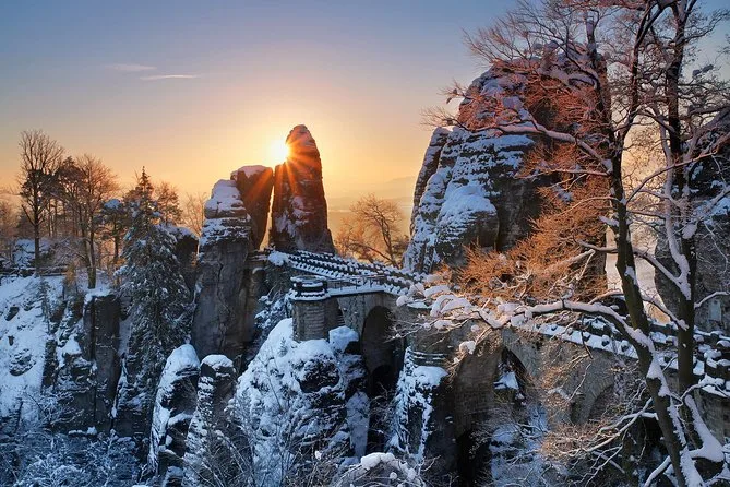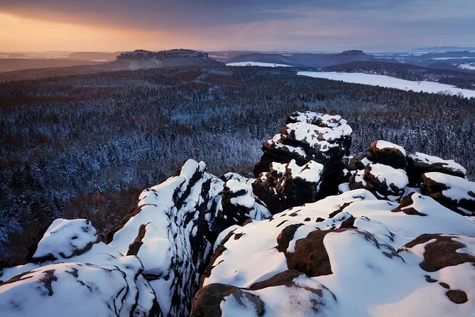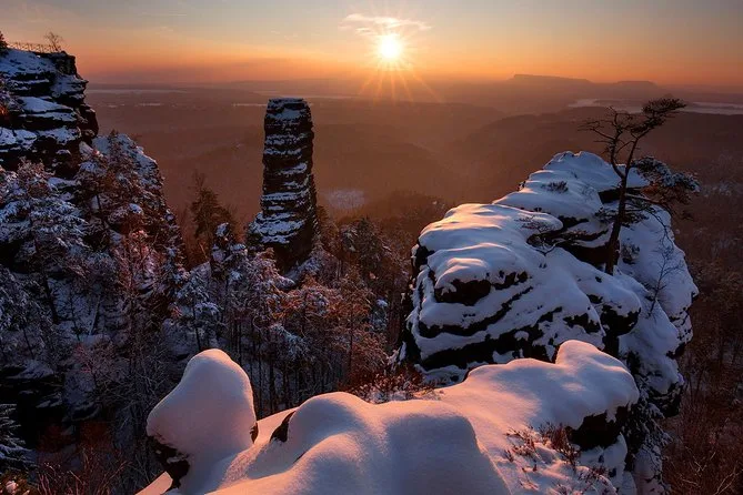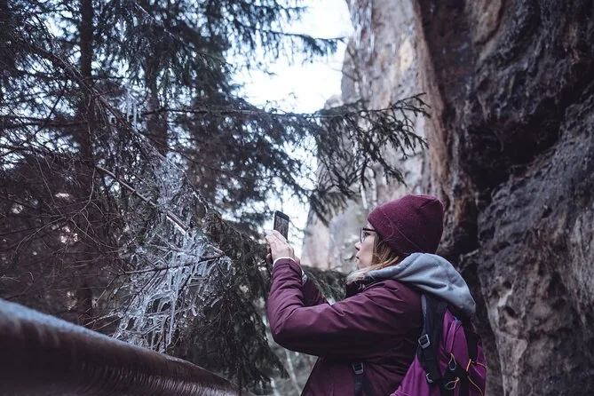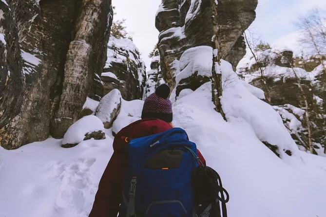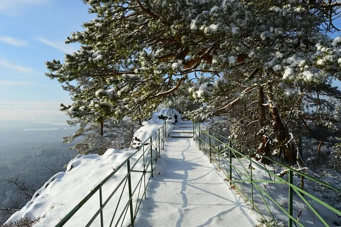 Camina por senderos nevados junto a torres de arenisca en el Parque Nacional Suiza Bohemia, llega a Pravcicka Gate sin multitudes, comparte historias durante la comida en U Forta y cruza el Puente Bastei sobre el cañón del Elba con un guía local. Una excursión desde Praga llena de momentos tranquilos y paisajes salvajes que recordarás mucho después de que la nieve se derrita.