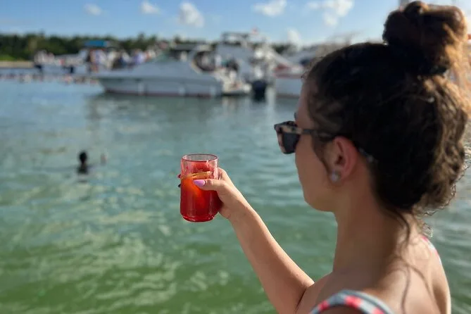 Después llegó lo que llaman “la Piscina Natural”—un enorme espacio poco profundo en el mar donde todos bajan del barco y se quedan de pie con el agua hasta la cintura y una bebida en la mano. Hay un bar flotante (sí, en serio), bachata sonando desde algún lado, gente riendo en español e inglés. Aparecieron snacks—principalmente chips de plátano—y pensé en lo fácil que era simplemente estar ahí, sin horarios ni presiones. Después de un rato volvimos navegando por la costa; vi pelícanos rozando el agua y sentí esa mezcla extraña de cansancio y felicidad que solo da el sol y el mar.