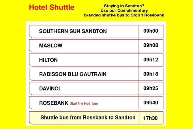 Sí, hay un servicio de traslado gratuito desde hoteles seleccionados en Sandton hasta el punto de inicio en Rosebank.