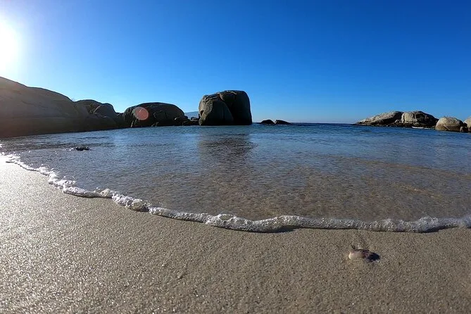 No soy un nadador experto, así que tener la boya de seguridad cerca me ayudó a relajarme y disfrutar flotando junto al grupo. Los guías estaban siempre atentos, llamándonos cuando veían algo especial, como un pulpo escondido en una grieta o pequeñas conchas de abulón enterradas en la arena. Tras cerca de una hora en el agua, regresamos a la orilla para una breve charla y nos cambiamos ahí mismo. Algunos se fueron en sus coches desde el lugar, pero yo volví con el grupo a Muizenberg, aún emocionado por todo lo que habíamos visto.
