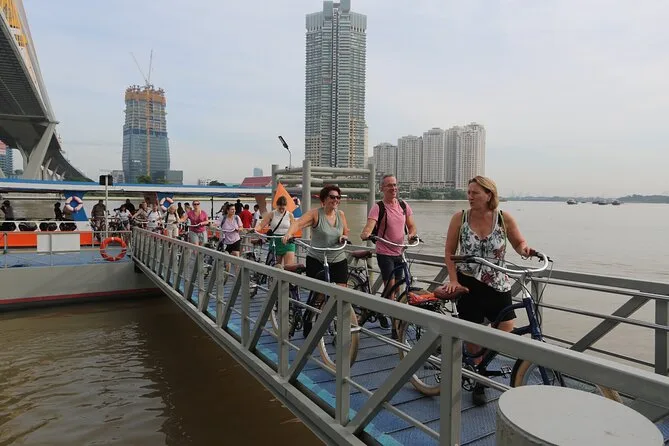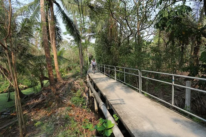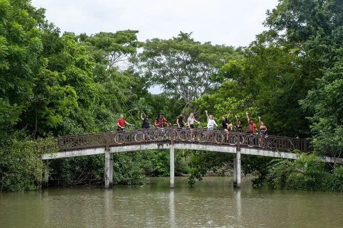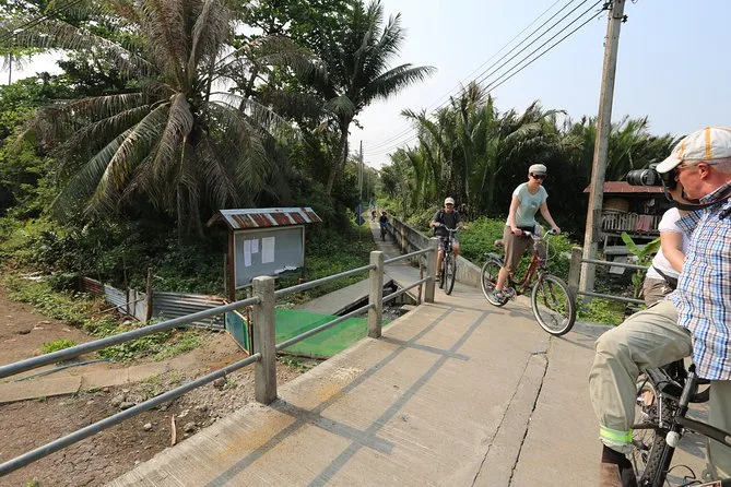 Pedalea desde Bangkok cruzando el río Chao Phraya hasta el tranquilo “Pulmón Verde” de Bangkrachao, por caminos elevados bajo palmeras. Visita templos centenarios con un guía local, ríe y comparte un almuerzo en un restaurante del barrio, y disfruta de parques donde el ruido de la ciudad desaparece para dejar solo calma.