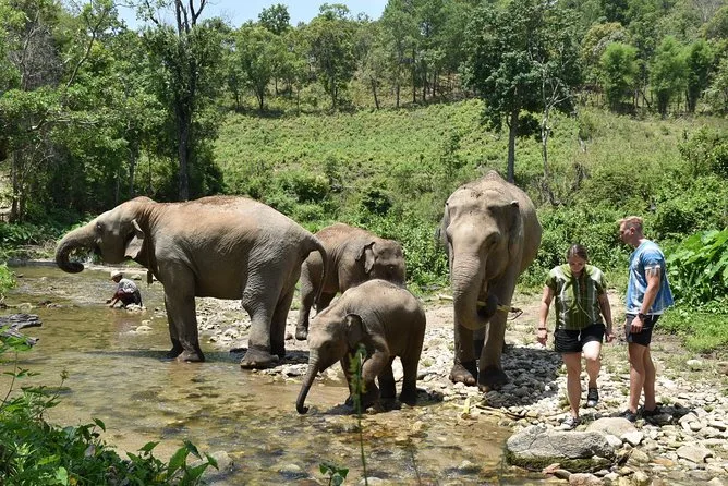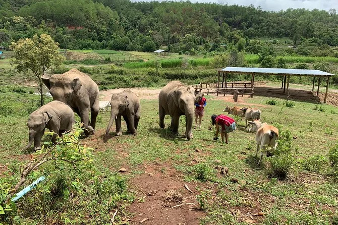 Tu día incluye transporte con aire acondicionado y recogida en hotel en Chiang Mai, entrada al santuario familiar de elefantes, guía en inglés (o japonés la mayoría de los días), agua durante la visita, seguro para tu tranquilidad y un almuerzo casero tailandés con frutas de temporada antes de regresar por la tarde.