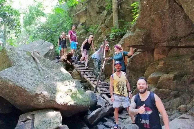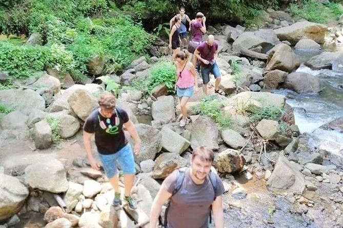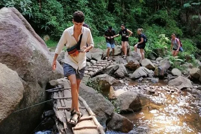 Después del almuerzo, Nok nos dio cascos para el rafting (casi se me olvida el mío). El río no era bravo, pero tenía los saltos justos para que nos riéramos mientras navegábamos bajo enredaderas y rápidos pequeños. Luego vino la caminata — dos horas por la selva densa con raíces resbaladizas y flores que no reconocía por ningún lado. Llegamos a una cascada que se sentía casi fría comparada con todo lo demás. Recuerdo estar ahí, sin zapatos, escuchando el agua golpear las rocas y pensar que quizá eso es lo que llaman “resetear”. Al final volvimos cubiertos de barro, calentados por el sol y con ese silencio tranquilo que llega después de un día largo al aire libre.