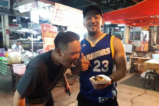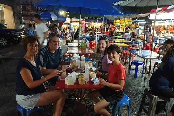 Nos sentamos donde había espacio, a veces compartiendo banco con familias o señores mayores viendo fútbol en el móvil. No había prisa — solo bocados lentos, historias de Natt sobre su infancia aquí, y algún intento de hablar tailandés que hacía reír a todos. Al final perdí la cuenta de los platos que probamos (más de ocho seguro), pero recuerdo la sensación: lleno, un poco pegajoso por el aire de la noche, feliz de dejar que otro llevara el ritmo por un rato. El regreso al hotel fue más tranquilo de lo que esperaba.