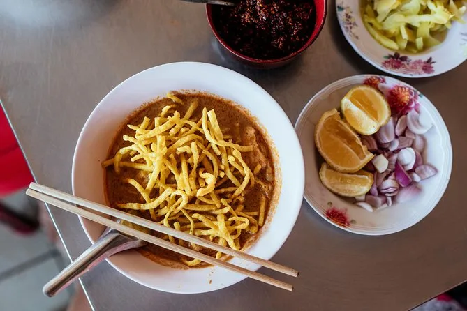 Recorre las calles de Chiang Mai con un guía local, probando 10 platos auténticos desde el picante Khao Soi hasta dulces en hoja de plátano. Haz pausas para visitar templos y escuchar historias entre bocados. Elige tu estilo de té tailandés y ríe mientras descubres nuevos sabores—este tour privado es mucho más que comida.