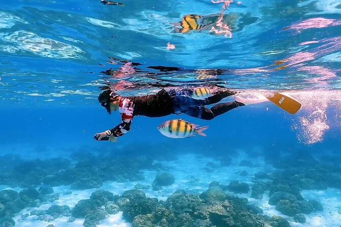 Luego fuimos a Banana Bay en Racha Noi. El viaje en bote estuvo un poco movido, pero nada exagerado. Nos pusimos el equipo de snorkel y nos sumergimos en aguas que desde arriba parecían un espejo. Había bancos de peces cola amarilla y peces loro que se deslizaban entre los corales; honestamente, perdí la noción del tiempo flotando ahí. Algunos vieron una raya azul moteada deslizándose cerca de las rocas.