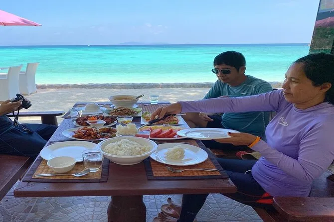 El almuerzo llegó justo cuando mi estómago empezó a rugir: una comida tailandesa sencilla en un pequeño restaurante de Racha Yai. Nada lujoso, pero el arroz frito y el pollo a la parrilla cayeron perfecto después de nadar. Después tuvimos tiempo para nadar más o simplemente echar una siesta bajo la sombra de unas palmeras (yo opté por ambas). De camino a la isla Maiton, nuestro guía mencionó que a veces aparecen delfines cerca del arrecife; esta vez no tuvimos suerte, pero muchos peces de colores compensaron la espera.