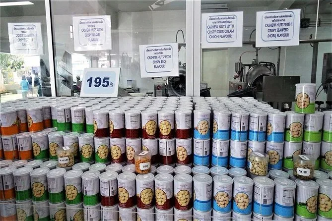 Tomamos bebidas frías en Wangtalang Lapidary antes de parar en la fábrica de anacardos. Nos dejaron probar anacardos calientes recién salidos del tostador, mucho mejores que los que venden en las tiendas. También hubo tiempo para comprar; había muchos snacks y souvenirs locales si te interesa.