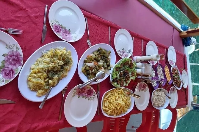 Tu día incluye opciones de recogida cercanas si las necesitas, todas las entradas y tasas pagadas de antemano, comida casera fresca servida a bordo junto con la hora del té turco con pastel y fruta por la tarde; tendrás acceso a Wi-Fi durante todo el viaje, además de equipo de snorkel y estaciones para cargar el móvil antes de regresar al puerto de Fethiye.