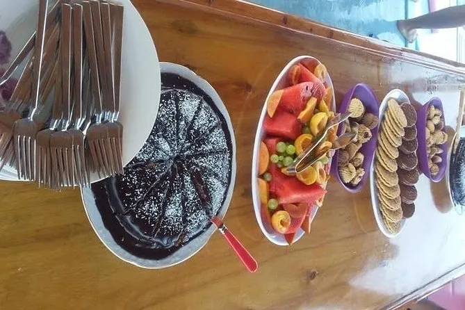 Más tarde, cuando paramos en una playa tranquila para descansar largo rato, alguien sacó una bandeja con pastel y galletas para la hora del té. Suena simple, pero sostener esa taza caliente mientras me secaba al sol me hizo sentir como en casa—aunque estuviera lejos de la mía. También había fruta—rodajas de sandía bien frías—y la gente las pasaba sin hacer lío. El Wi-Fi funcionó bien para enviarle una foto a mi mamá (me respondió “¡qué envidia!”). Después el día se volvió una mezcla: más baños, tomar el sol perezosamente en los cojines de la cubierta, niños durmiendo bajo toallas.