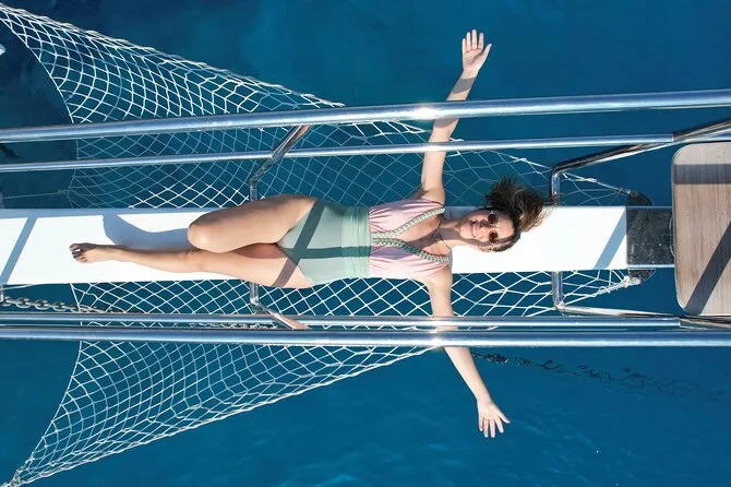 Más tarde, en la Bahía del Acuario, Emre me pasó una máscara de snorkel y dijo: “Vas a entender por qué le llaman así.” No exageraba: pececillos plateados por todos lados, rocas cubiertas de un suave musgo verde. Mi amiga intentó nombrar todos los peces que veía (acertó con dos). La comida a bordo me sorprendió: pollo a la parrilla, ensaladas con aceite de oliva y limón, pan aún calentito de algún lugar bajo cubierta. Comí demasiado, pero no podía parar. Después de eso, todos parecieron relajarse; la gente empezó a contar historias o simplemente se recostó con los pies en alto.