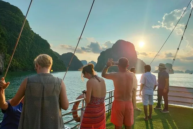 Regresamos navegando mientras el sol empezaba a caer, y todos nos quedamos en silencio un rato — quizás cansados o simplemente asimilando todo. Minh repartió tazas de té caliente y nos contó que su tío solía pescar aquí antes de que el turismo creciera tanto. Me hizo pensar cómo sería este lugar antes de que llegaran tantos barcos… En fin, si quieres aprovechar al máximo un día desde Hanoi a la Bahía de Ha Long, este es el plan ideal.