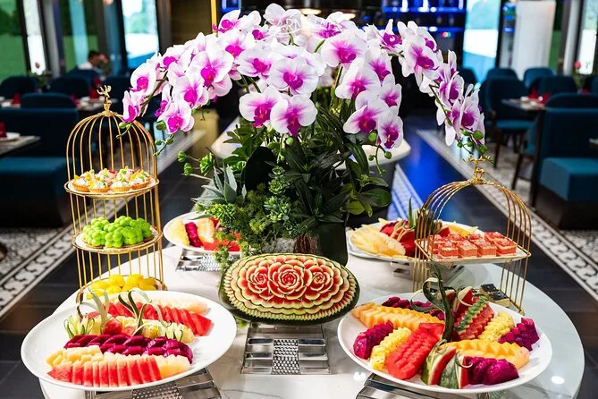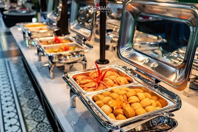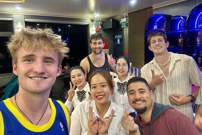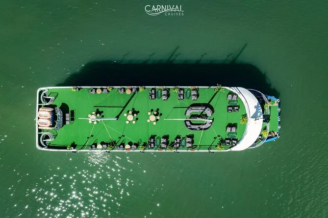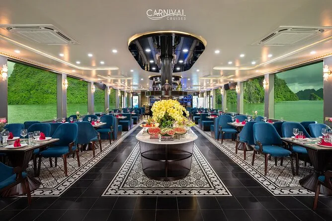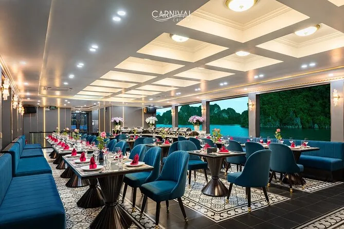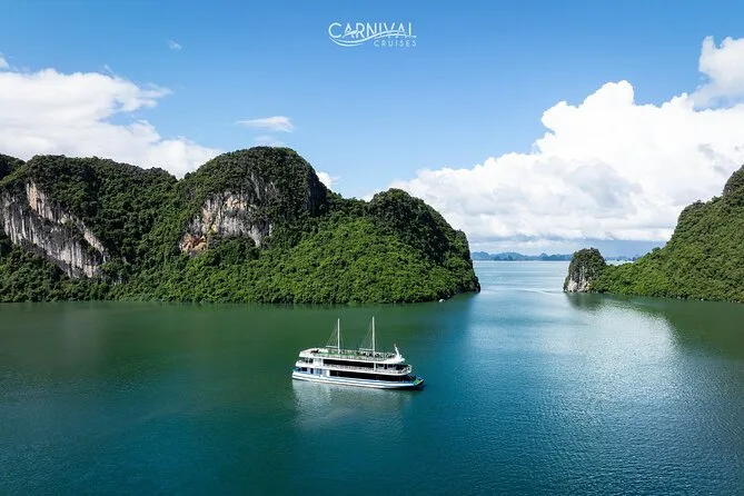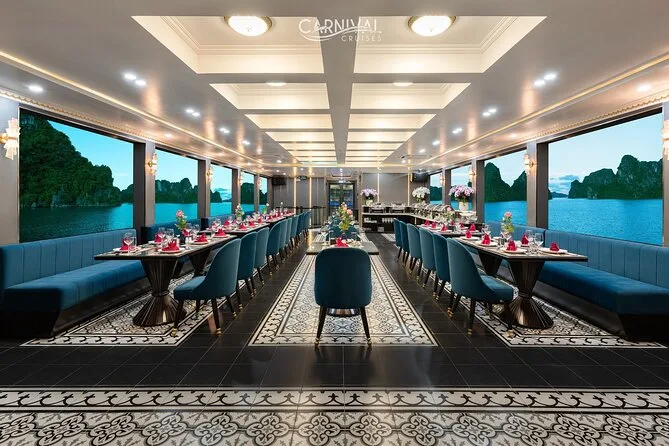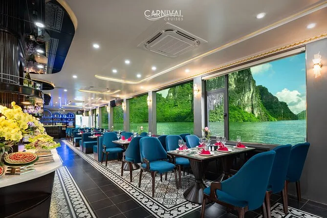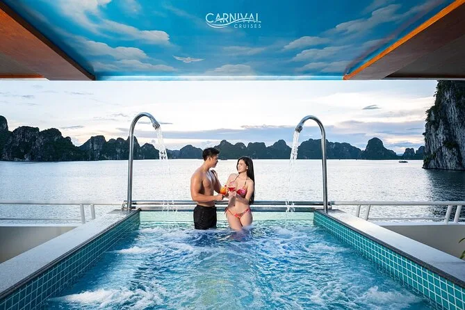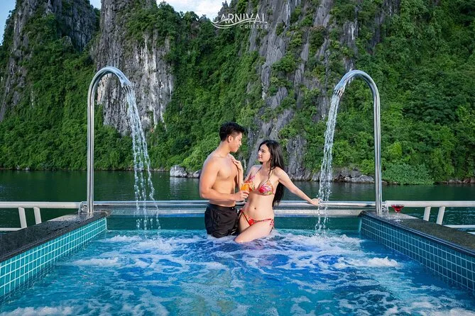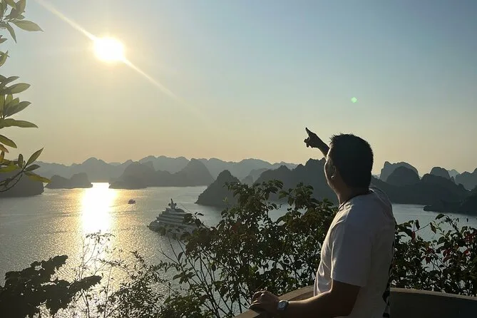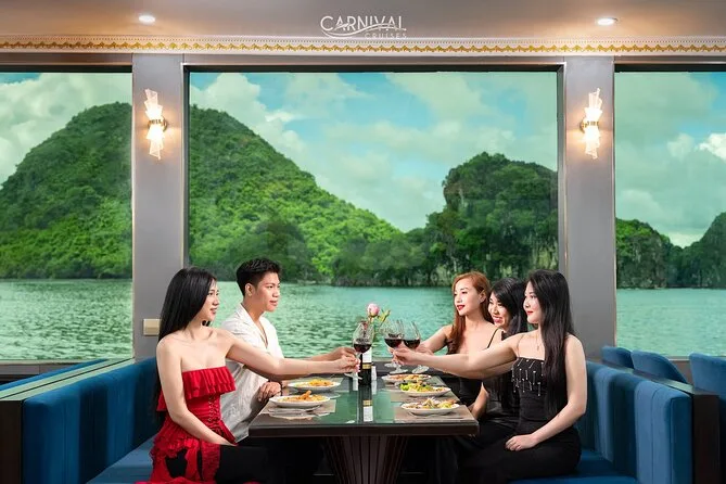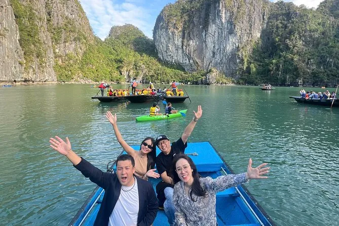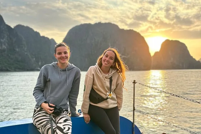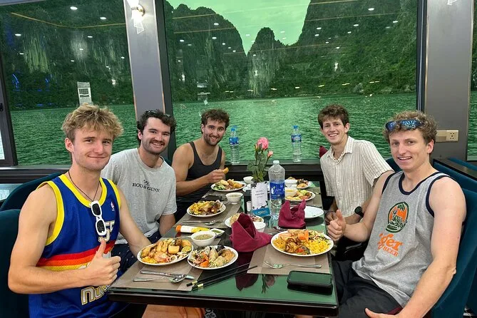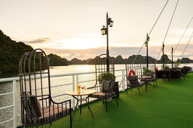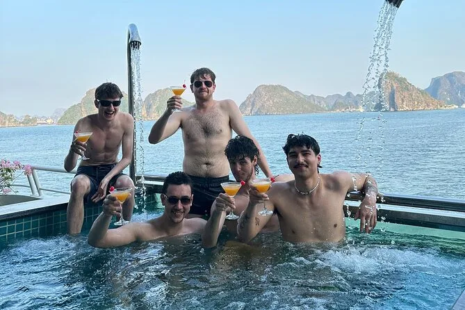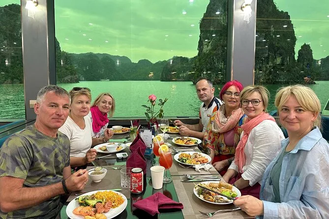 Tu día incluye recogida en hotel en Hanoi (si eliges esta opción), entradas a todos los sitios como la cueva de la Sorpresa y la isla Titop, alquiler de kayak o bote de bambú en la cueva Luon, guía en inglés durante todo el crucero de lujo (unas 6-7 horas), almuerzo buffet o menú según el tamaño del grupo, snacks y café o té en la fiesta al atardecer antes de regresar al puerto, y seguro a bordo.
