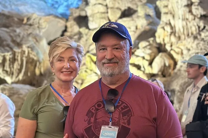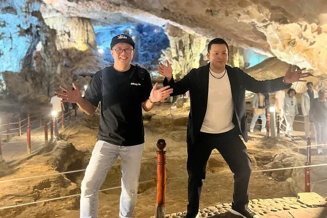 El almuerzo fue un torbellino de sabores — recuerdo algo dulce con jengibre y las vistas de los acantilados pasando lentamente por la ventana. En la isla Bo Hon subimos a la Cueva de la Sorpresa. Es más grande de lo que imaginas; fresca por dentro, con estalactitas que gotean como cera de vela. Minh nos mostró una roca que parecía una tortuga (yo todavía no la veo), pero todos asintieron con simpatía. Toqué una pared — húmeda y áspera, casi como coral antiguo.