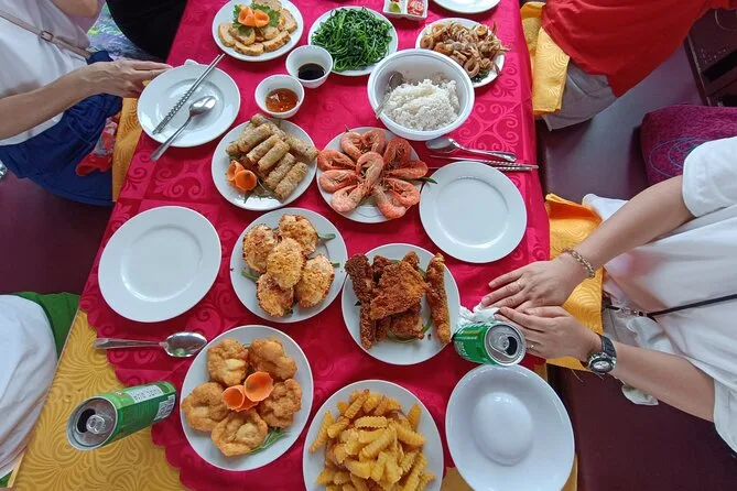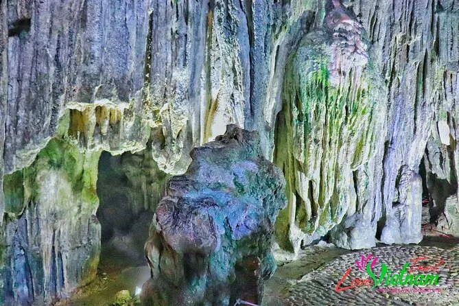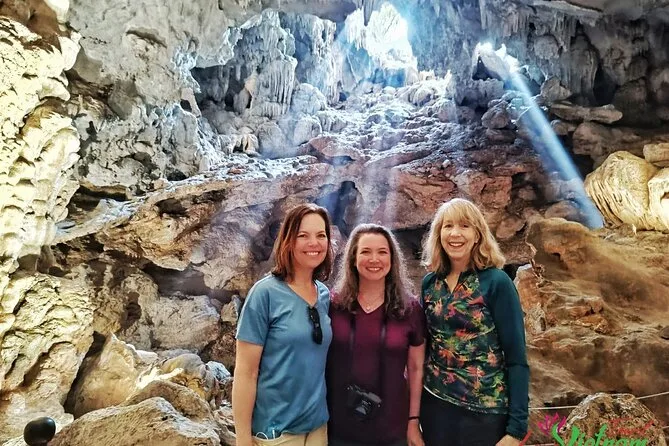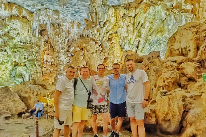 El almuerzo fue sencillo pero delicioso: patas de cangrejo que me dejaron los dedos pegajosos y arroz con un leve toque de jengibre. Después subimos a la cueva Thien Cung — no sabía qué esperar, pero adentro todo eran sombras marcadas y formaciones rocosas extrañas que parecían casi vivas bajo luces de colores. Hieu señaló una formación que dijo parecía un dragón; yo más bien vi un perro dormido, pero quizá soy yo. La bajada fue resbaladiza y alguien detrás empezó a tararear suavemente — esa melodía se me quedó en la cabeza hasta llegar a la marina.
