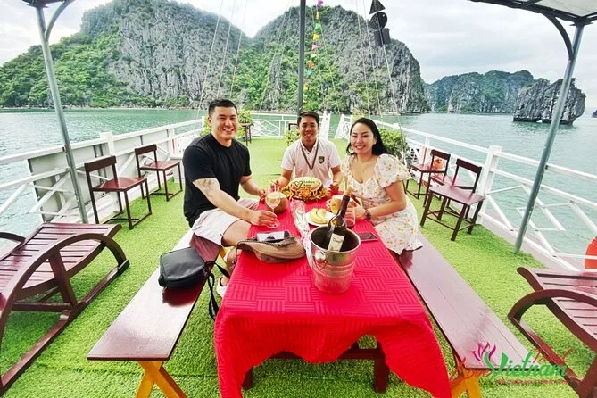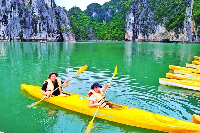Viaja de Hanoi a la bahía de Halong con recogida en hotel, luego sube a un crucero privado entre islas de piedra caliza y lugares emblemáticos como la isla Fighting Cocks. Elige entre kayak o bote de bambú en la aldea Ba Hang y recorre la cueva Thien Cung antes de regresar — disfruta un almuerzo de mariscos frescos y muchos momentos de tranquilidad en el agua.
