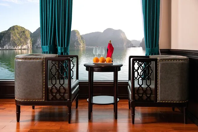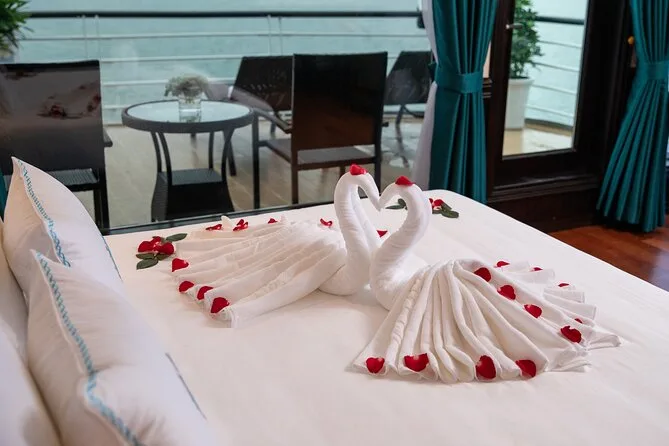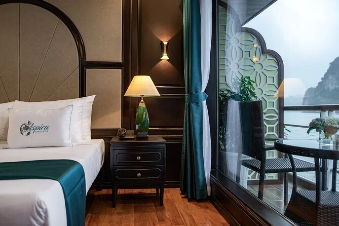 Contarás con una junior suite con balcón privado y vistas a la Bahía de Halong.