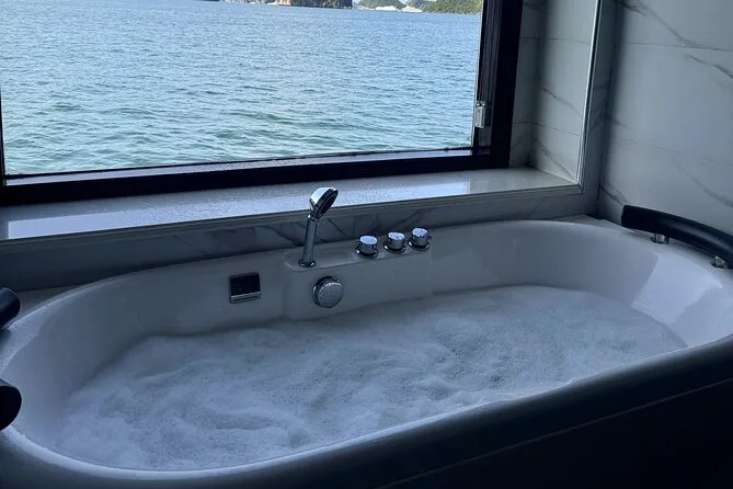 Despertar en el Barrio Antiguo de Hanoi fue rápido, apenas tuve tiempo para un café antes de que llegara la van — justo a tiempo para recogernos en el hotel. El viaje hacia Halong fue más tranquilo de lo que esperaba; campos envueltos en niebla y ráfagas de motos pasando por la ventana. Al mediodía subimos al Aspira Cruise, donde nos recibieron con toallas frías y un aroma cítrico en el aire — ¿será hierba limón? Nuestro guía Minh nos dio una breve explicación de seguridad (confieso que me desconecté a mitad), y luego nos llevó a nuestra cabina. Balcón privado, bañera con vista al mar… casi no quería salir de ahí.