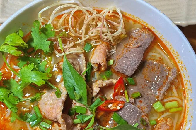 Prepararás Bun Bo Hue (sopa de fideos con carne), Banh Xeo (crepe crujiente), rollito fresco Tam Huu, ensalada de jackfruit y helado de aguacate de Da Nang.