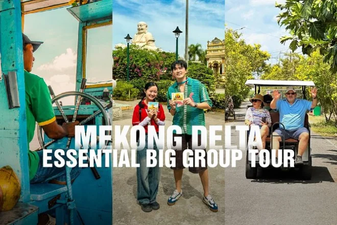 Únete a otros viajeros en una excursión de un día desde Ho Chi Minh al Delta del Mekong: navega por ríos entre pueblos pesqueros, explora los colores de la pagoda Vinh Trang, prueba té de miel en una casa local y comparte un almuerzo mientras la música folclórica suena de fondo. No es solo turismo, es sentir el ritmo tranquilo de Vietnam por un día.